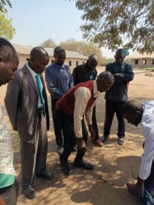 The men are enthusiastic and impressed by the new, simple method. We all go outside and, armed with a homemade measuring cord and African hoe, we show a practical demonstration. There is much laughter when Arjan, the azungu, digs holes in the hard ground for the first time with the unfamiliar tool. Everyone joins in. One person fetches ash and puts it in the hole, another throws in so-called manure, another covers it and ‘plants’ the three corn seeds, and another looks for leaves to cover it. We have fun.