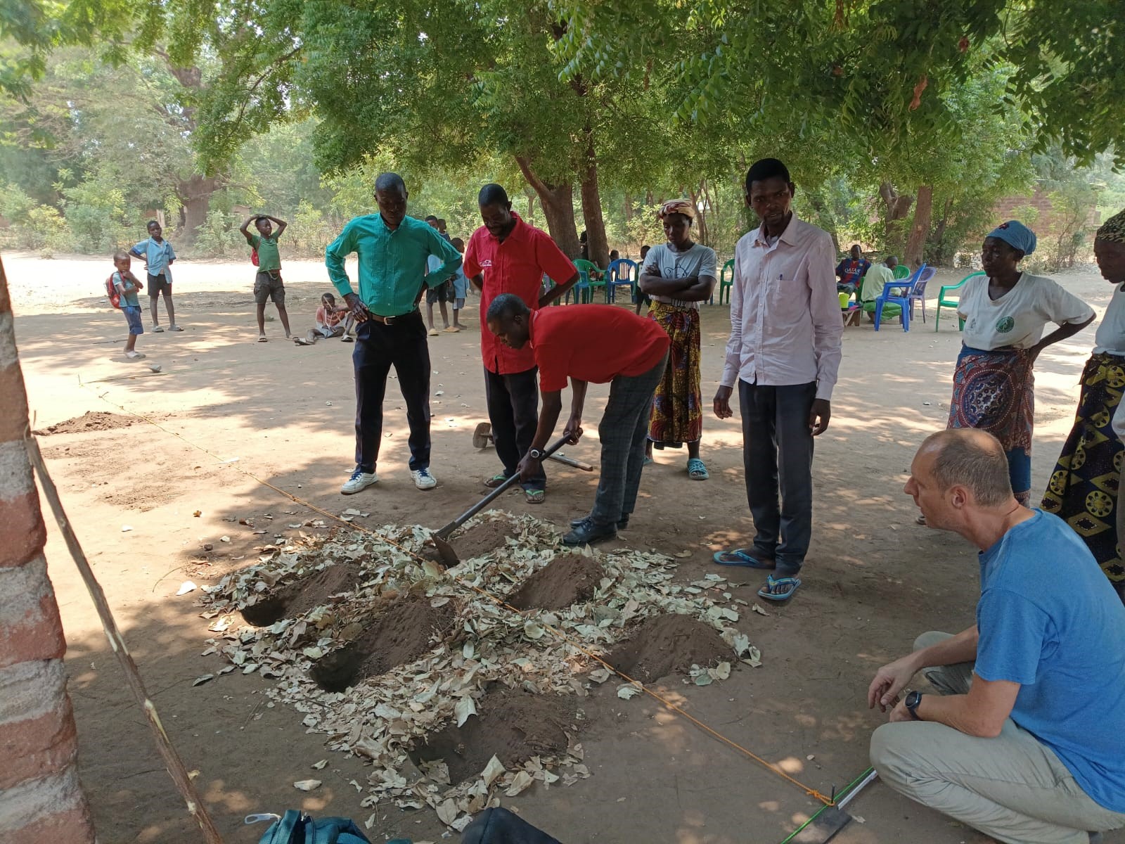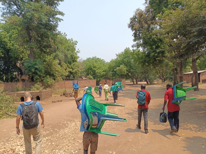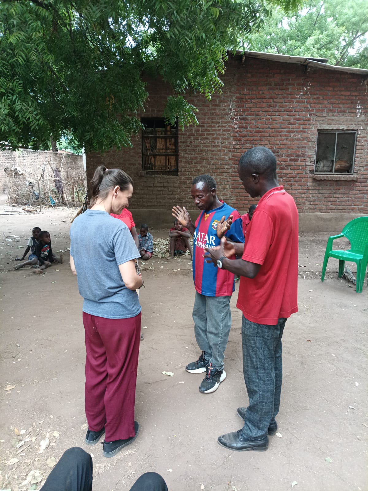 We were allowed to use the nearby church building of another church. But it was so hot that we often preferred to sit in a circle under the tree with a breeze at the local pastor’s house in the afternoon. We used the church building for our cinema to show the Farming God’s Way videos. So, we regularly walked with our plastic chairs to the shade of a tree or to the church for a movie screening.