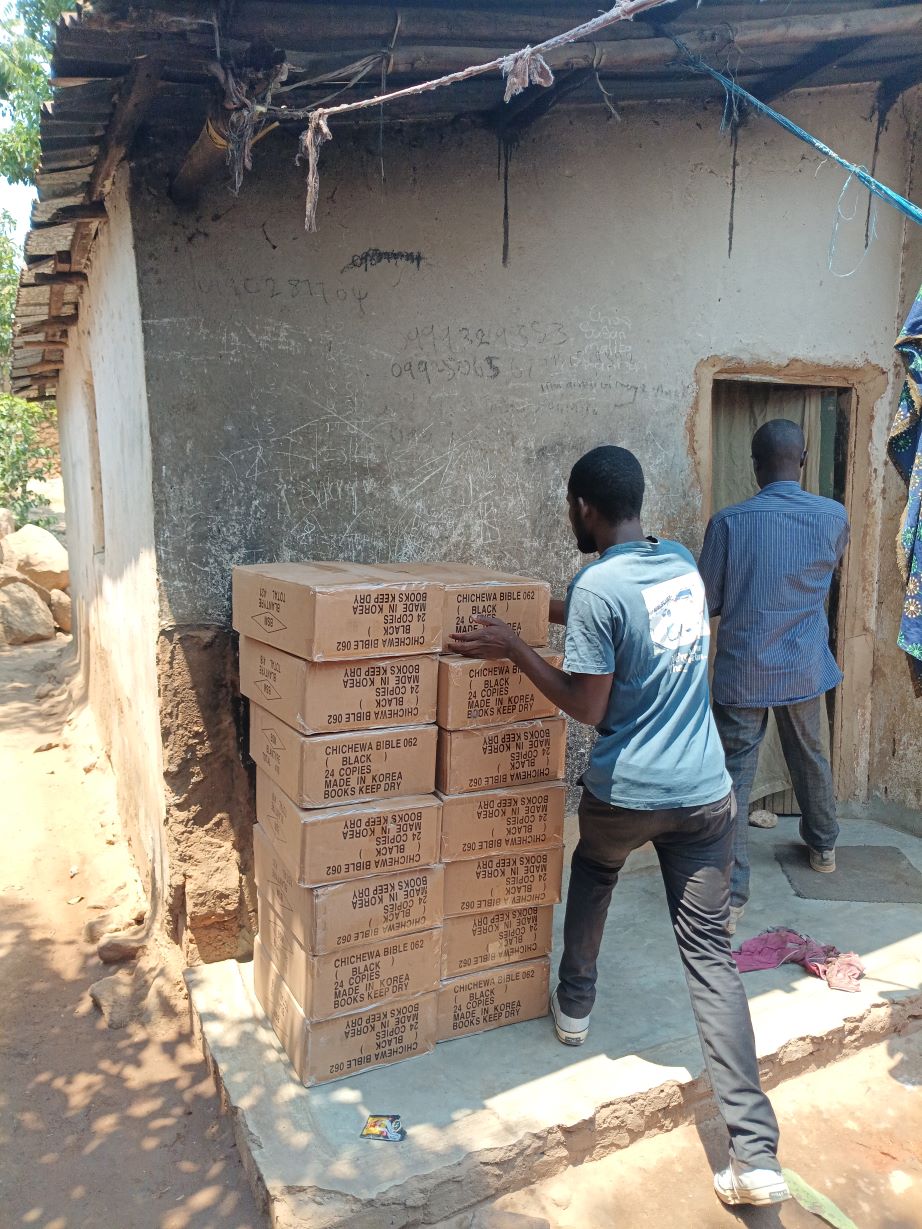 Once again, the Bible Society saw us return this week for the second batch of Bibles. This time, 14 heavy boxes, songbooks, and children’s Bibles. In an old rattling van, we drove up the bumpy, unpaved rocky “road” to the mountain where Byson lives. The men were already waiting to carry the boxes on their heads along the goat path to the church of Byson.