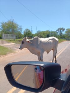 Our journey continued through the south of Paraguay. It is truly enjoyable to drive through the vast green landscape with red-colored earth. Cows are regularly tethered to a rope on the side of the road, grazing. But sometimes they break loose and want to test the grass on the other side of the road. So, in addition to the many stray dogs, bumps, and potholes in the asphalt, you also have to watch out for these animals.
